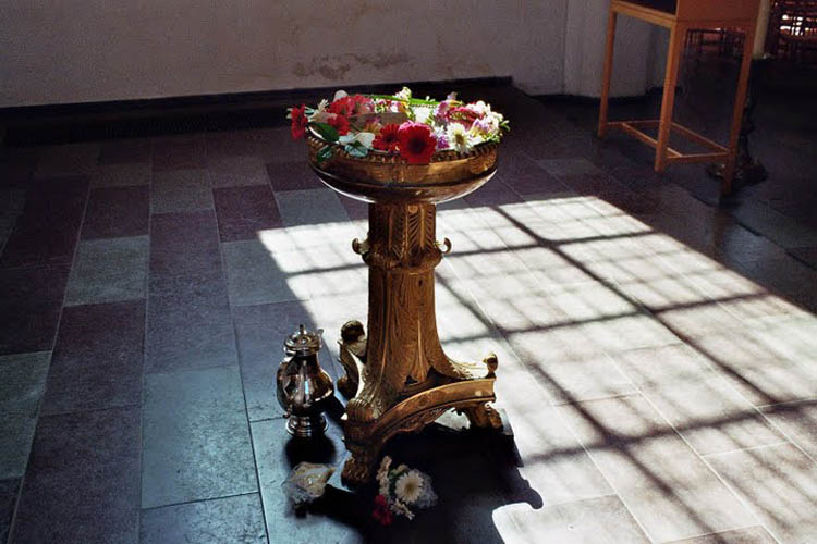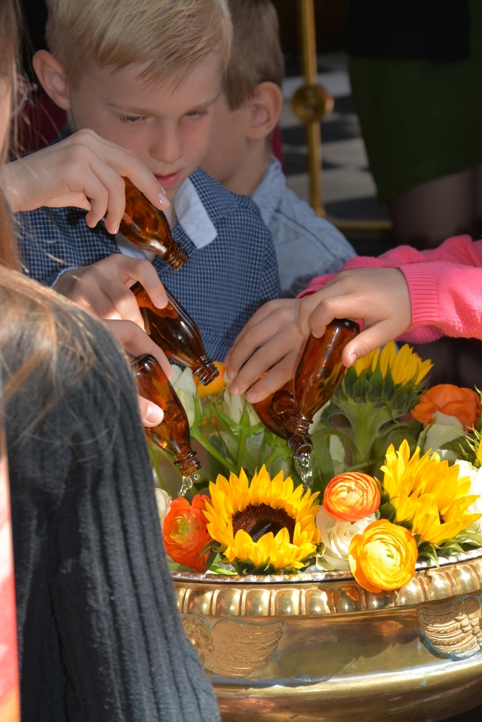 In Petri schmücken die Kinder das Taufbecken mit Blumen